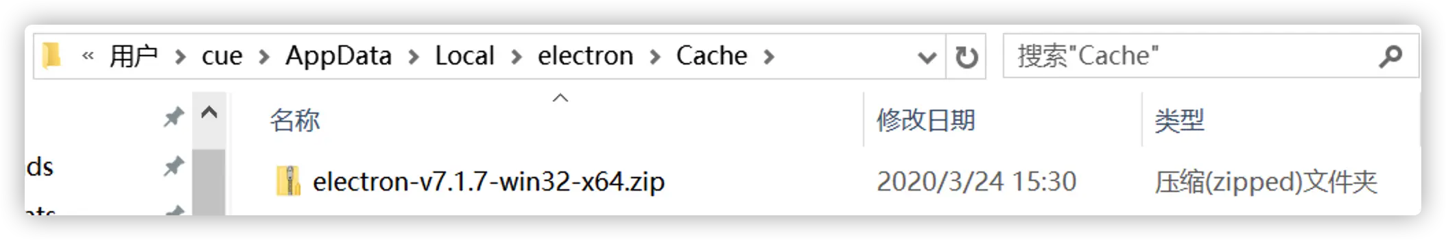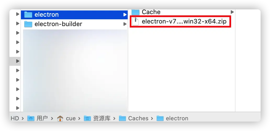 - 将下载好的electron-v7.1.7-win32-x64放在 /Users/cue/Library/Caches/electron下