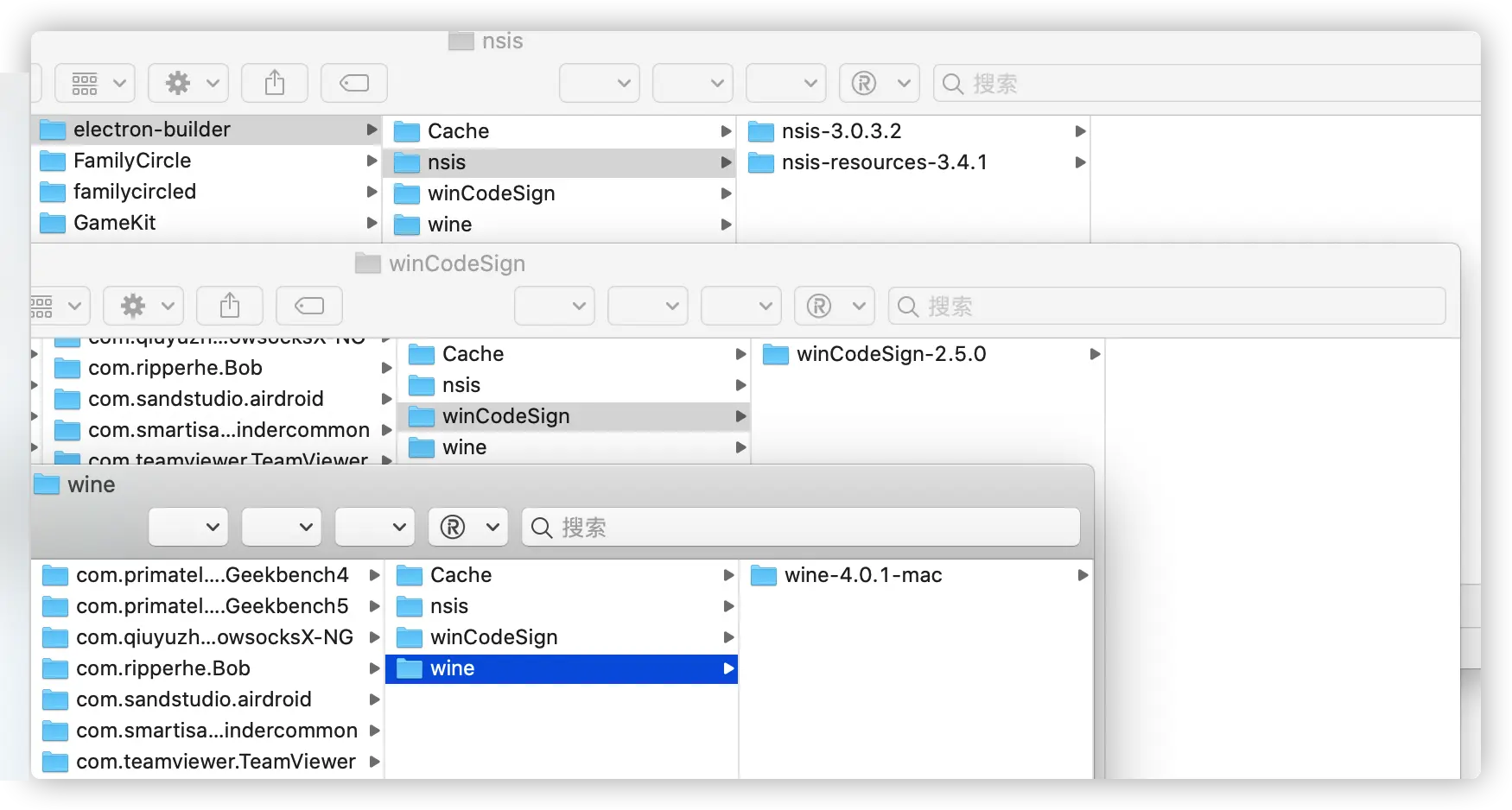 - 在electron-build则首先创建好nsis、winCodeSign、wine这几个文件夹,让后我们将这几个文件独立下载然后解压到相关的目录下就好了