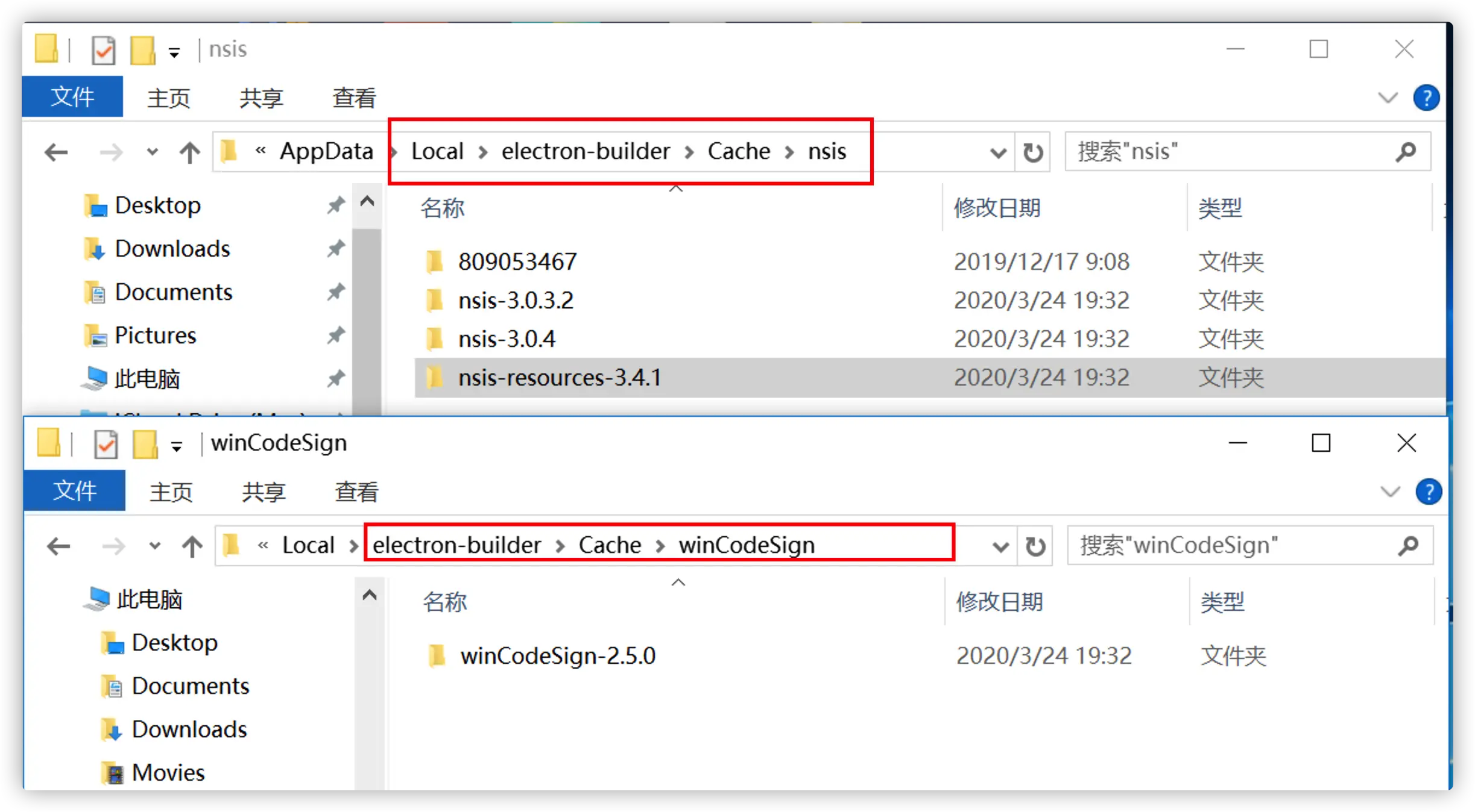 - 将文件分别解压放在C:\Users\cue\AppData\Local下的electron\Cache、electron-build\Cache\nsis、electron-build\Cache\winCodeSign中,参照下图