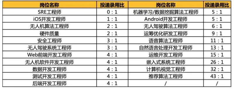 不过如果还是有人想知道什么岗位容易找到工组的话,博主这里看到了某大厂一份 2020 年实习生的录用比,供大家参考。