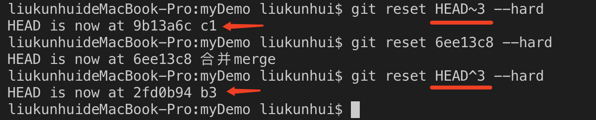 截图里的操作序列,还少了一个比较重要的点,就是git reset HEAD~命令会将HEAD移动到当前commit的第一个父亲节点(9b13a6c 合并),所以从上两个图可以看出,^和~的区别,但目前本人很少遇到用到这两个命令的场景,也暂不了解这两个命令有什么高级的用法,所以点到为止。