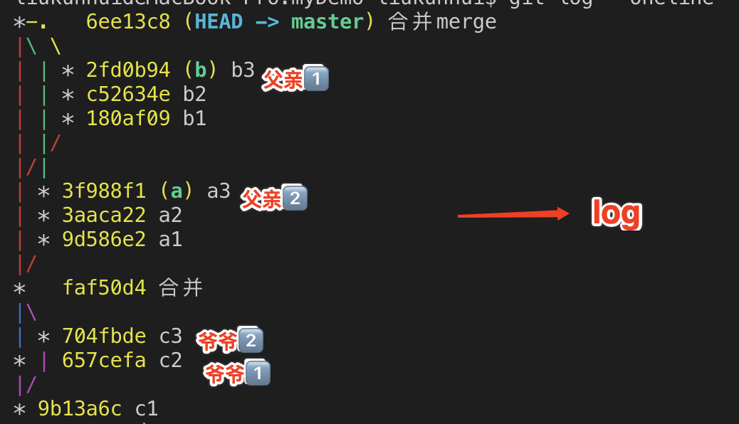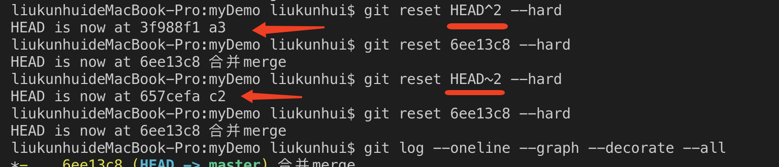 这两个符号在三中的操作中,经常会用到,个人理解为移动指针的单位。一中提到,commit之间存在父子关系,当commit是一条链没有分叉时,父子关系是递增下去的。如果是中间有合并操作,则上一次合并操作为父亲(暂时怎么理解,我了解的也不够深)。