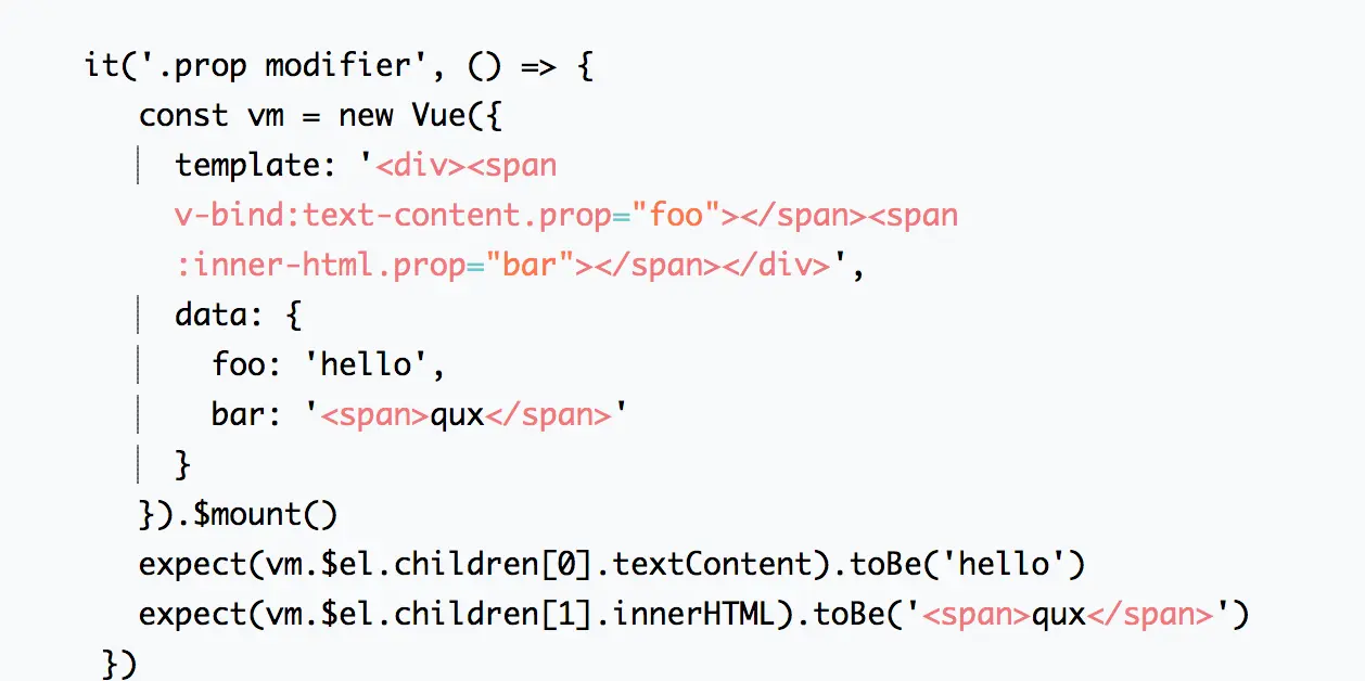 另外对于这个修饰符,vue应该也提供了一个缩写的形式。即.text-content="foo"。 单元测试代码如下: it('.prop modifier shorthand', () => { const vm = new Vue({ template: '
