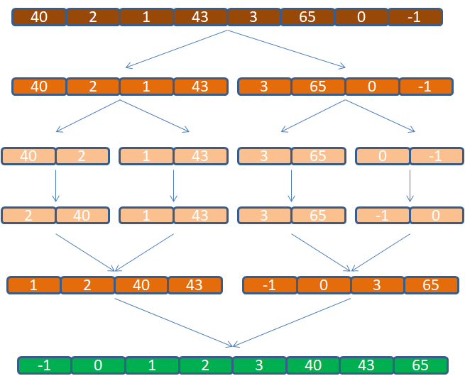 将数组按每次拆成两个数组递归进行拆分,最后得到的仅有两个数值时再进行比较,然后依次两两合并,