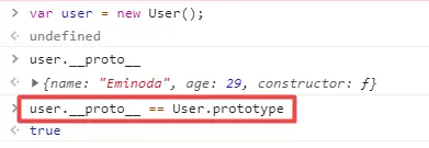 接着讲说下构造函数实例出来的对象 user,实例化后的对象将含有一个 _proto_ 属性(或者为 [[Prototype]]),它是个非显性的属性。 我们可以显示的来调用它: