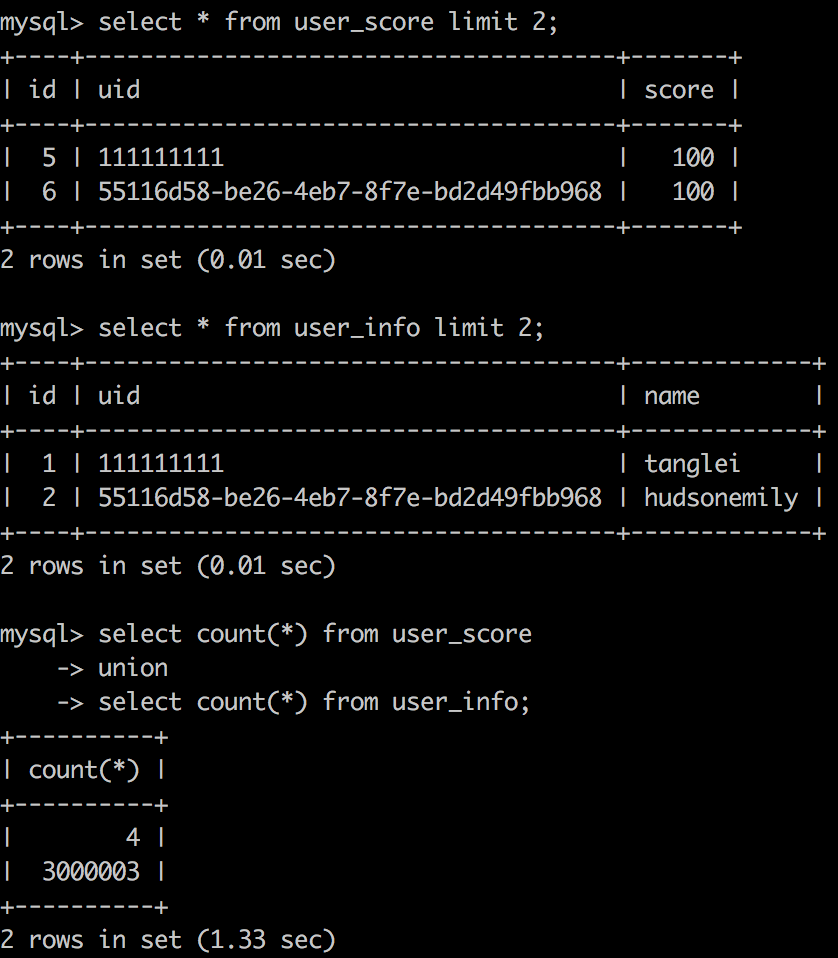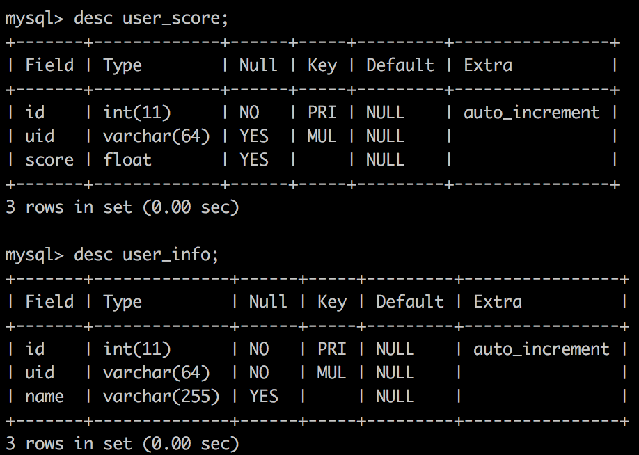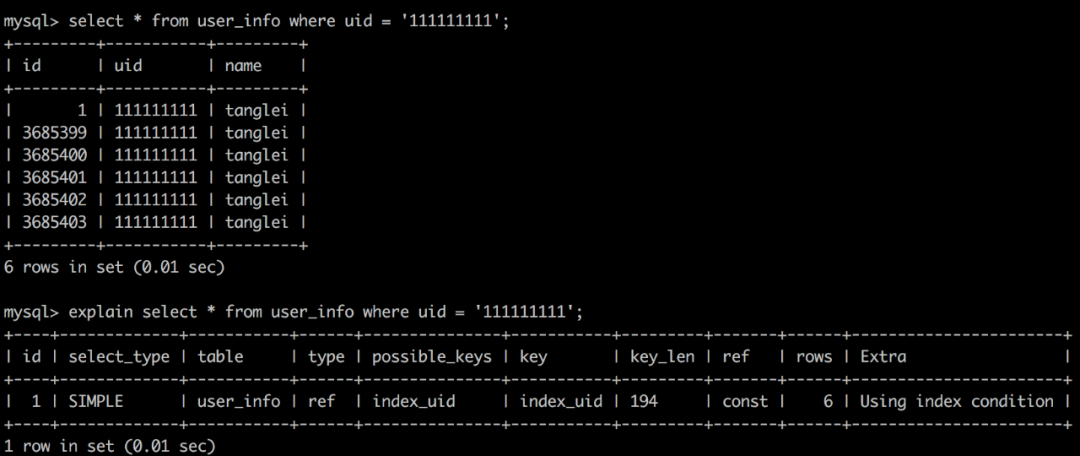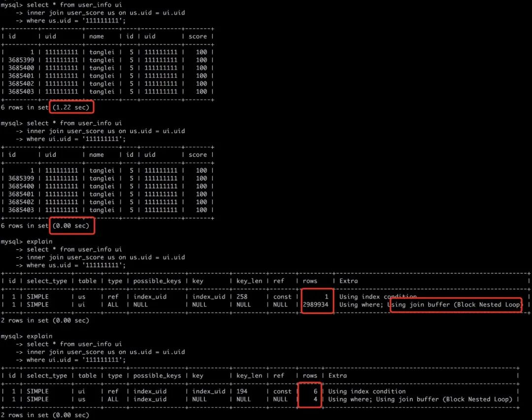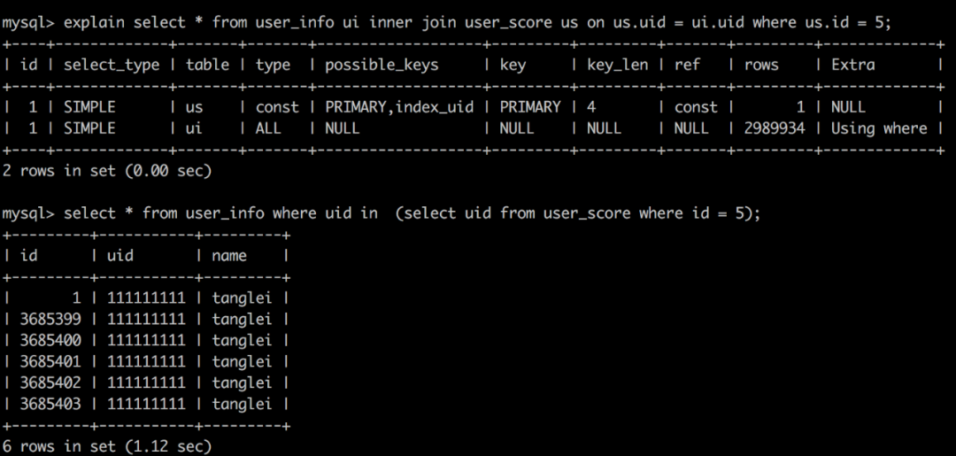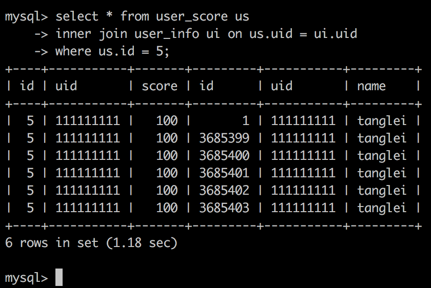 mysql> select * from user_score us -> inner join user_info ui on us.uid = ui.uid -> where us.id = 5;+----+-----------+-------+---------+-----------+---------+| id | uid | score | id | uid | name |+----+-----------+-------+---------+-----------+---------+| 5 | 111111111 | 100 | 1 | 111111111 | tanglei || 5 | 111111111 | 100 | 3685399 | 111111111 | tanglei || 5 | 111111111 | 100 | 3685400 | 111111111 | tanglei || 5 | 111111111 | 100 | 3685401 | 111111111 | tanglei || 5 | 111111111 | 100 | 3685402 | 111111111 | tanglei || 5 | 111111111 | 100 | 3685403 | 111111111 | tanglei |+----+-----------+-------+---------+-----------+---------+6 rows in set (0.00 sec)mysql> explain -> select * from user_score us -> inner join user_info ui on us.uid = ui.uid -> where us.id = 5;+----+-------------+-------+-------+-------------------+-----------+---------+-------+------+-------+| id | select_type | table | type | possible_keys | key | key_len | ref | rows | Extra |+----+-------------+-------+-------+-------------------+-----------+---------+-------+------+-------+| 1 | SIMPLE | us | const | PRIMARY,index_uid | PRIMARY | 4 | const | 1 | NULL || 1 | SIMPLE | ui | ref | index_uid | index_uid | 194 | const | 6 | NULL |+----+-------------+-------+-------+-------------------+-----------+---------+-------+------+-------+2 rows in set (0.00 sec)