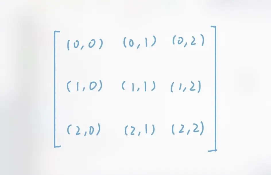 我们对照上面两张图观察一下,可以看出对于坐标(i, j)来说,它旋转90度之后得到的结果应该是(j, n-1-i)。这里的n是行数。