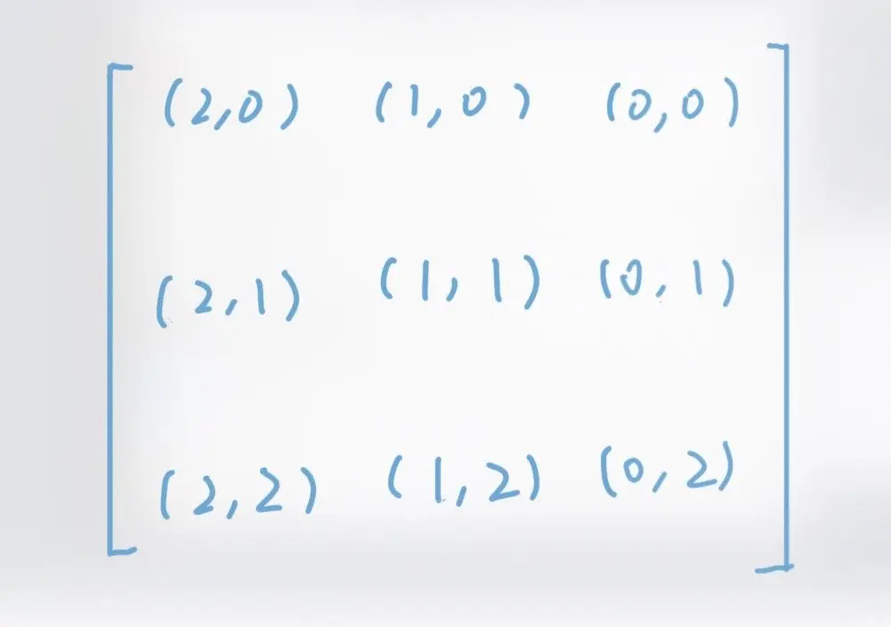 我们忽略矩阵当中具体的数据,而来看看矩阵旋转前后的坐标变化。这是矩阵旋转之前的坐标: