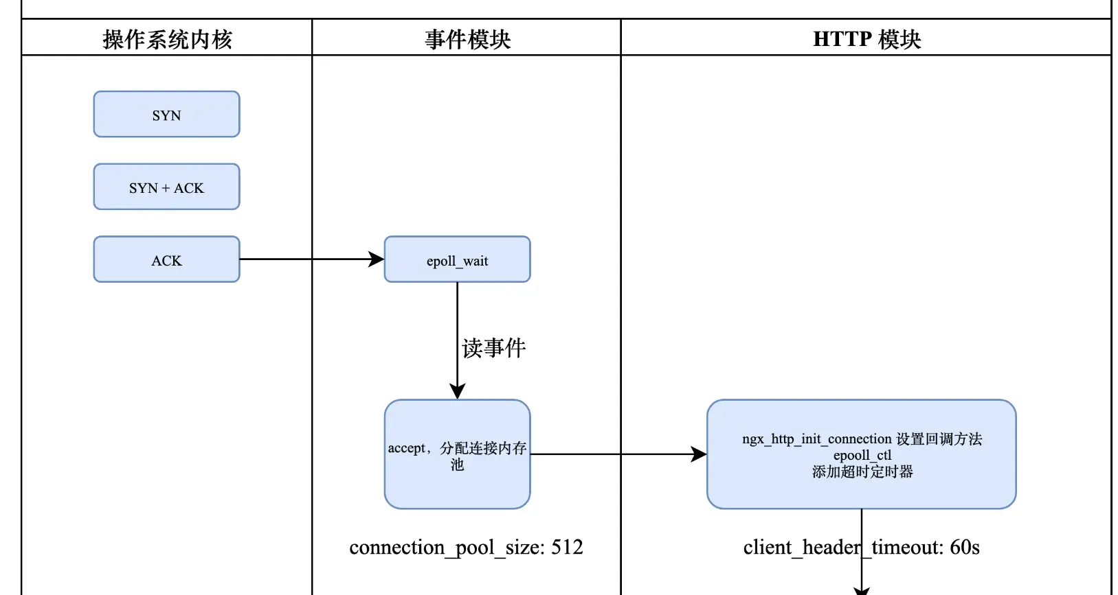 连接内存池大小的配置是 connection_pool_size,到了这一步之后,Nginx 会为已经建立的连接分配一个 512 字节大小的连接内存池。分配完内存池,建立好连接之后,HTTP 模块会从事件模块手里接入请求处理的过程,HTTP 模块在启动时,会调用 ngx_http_init_connection 方法来设置回调方法,这个时候会把新建立连接的读事件通过 epoll_ctl 函数添加到 epoll 中,然后加一个超时定时器 client_header_timeout: 60s,这个定时器的作用是,如果超过 60s 还没有接收到客户端发来的请求,那么就会断开连接。这一部分走完之后,Nginx 的事件模块可能就会切换到其他的句柄去处理了。