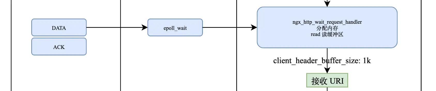 当用户真的把请求发来之后,操作系统会回复一个 ACK,同时事件模块的 epoll_wait 也拿到了这个请求,这个时候会调用设置的回调方法 ngx_http_wait_request_handler,将接收到的用户请求读到用户态中,而读取到用户态中需要操作系统分配内存,那么这段内存分配多大?从哪里分配呢?