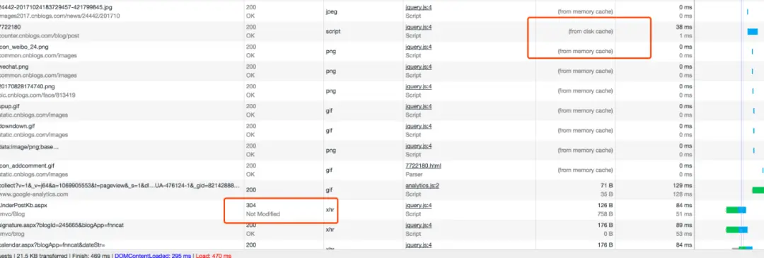 在谷歌浏览器按 F12 之后的 network 选项中可以看出:命中协商缓存的请求,会得到304状态码,然后浏览器就会从本地缓存中读取资源。