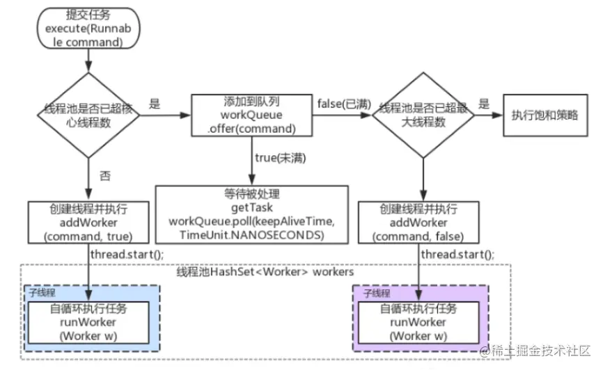 这行代码 while (task != null || (task = getTask()) != null) ,确保了 worker 不停地从 workQueue 中取得 task 执行。getTask 方法会从 BlockingQueue workQueue 中 poll 或者 take 其中的 task 出来。