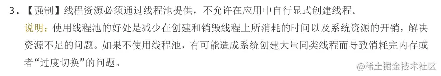 我们来看阿里巴巴的代码规范,在项目中创建线程必须要使用线程池创建,原因也是我说的以上三点。
