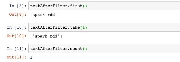 其中first的用处是返回第一个结果,take需要传入一个参数,指定返回的结果条数,count则是计算结果的数量。和我们逾期的一样,当我们执行了这些操作之后,spark为我们返回了结果。