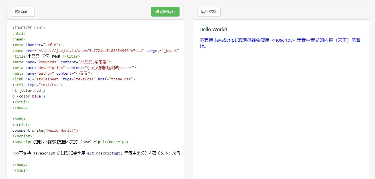 <p>不支持 JavaScript 的浏览器会使用 <noscript> 元素中定义的内容(文本)来替代。</p>