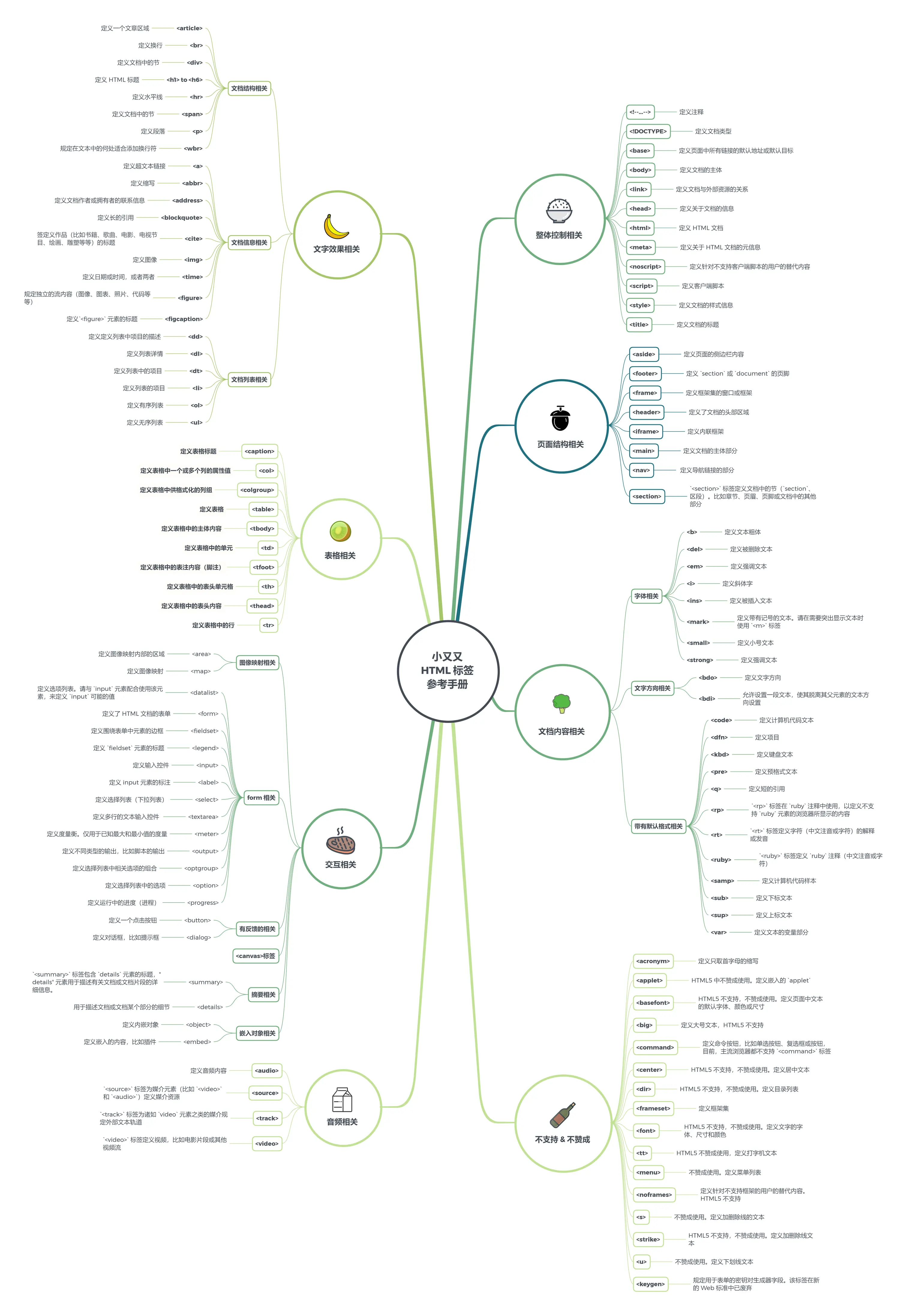 一共是 118 个 HTML 标签,除去 16 个 HTML 标签不建议的标签,还有 102 个 HTML 标签,小又又这边按照主观理解进行分了 7 类。