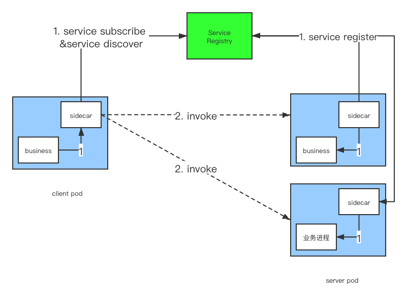 - 步骤1中,服务提供者pod在启动时,由sidecar向注册中心注册当前应用的地址(业务进程地址或者是sidecar地址,不同实现有所区别)。服务消费者在启动时,向注册中心订阅自己所需的服务。注册中心返回服务提供者地址列表给sidecar,如果有变更,注册中心将基于长轮询或者长连接推送变更数据给sidecar。
