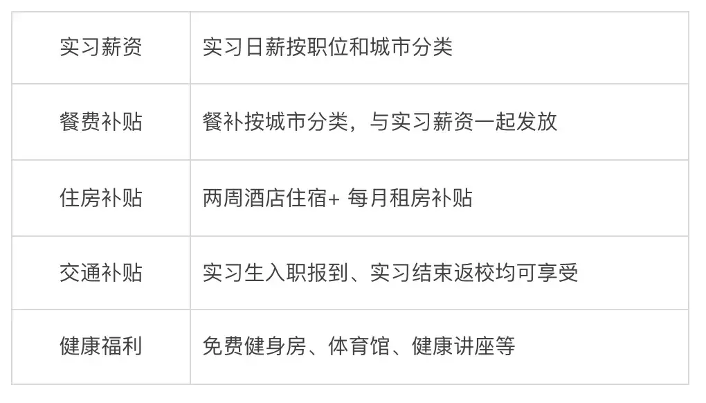 • 招聘流程:内推——完善简历——在线笔试——简历评估——面试——发放实习offer——安排实习
