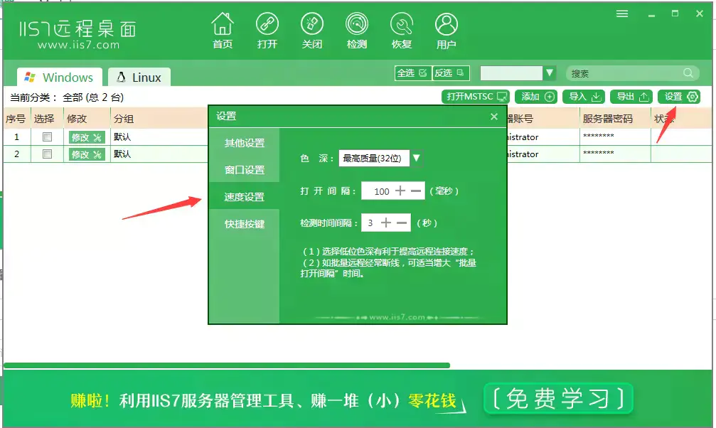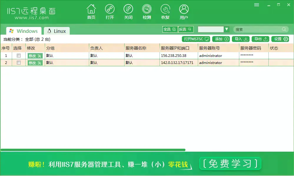 该组件一经推出受到了很多用户的拥护和喜好,所以在WINDOWSXP和2003中微软公司将该组件的启用方法进行了改革,我们通过简单的勾选就可以完成在XP和2003下远程桌面连接功能的开启。当然随着时代的进步,我们操作管理的模式也在不断的更新。为了更方便的我们管理我们的服务器,越来越多的人都会用到远程桌面管理连接服务器,让我们更方便跟简洁的用一台电脑来批量操作我们的VPS服务器,现在IIS7远程桌面管理这是我觉得比较好用的一款程序。