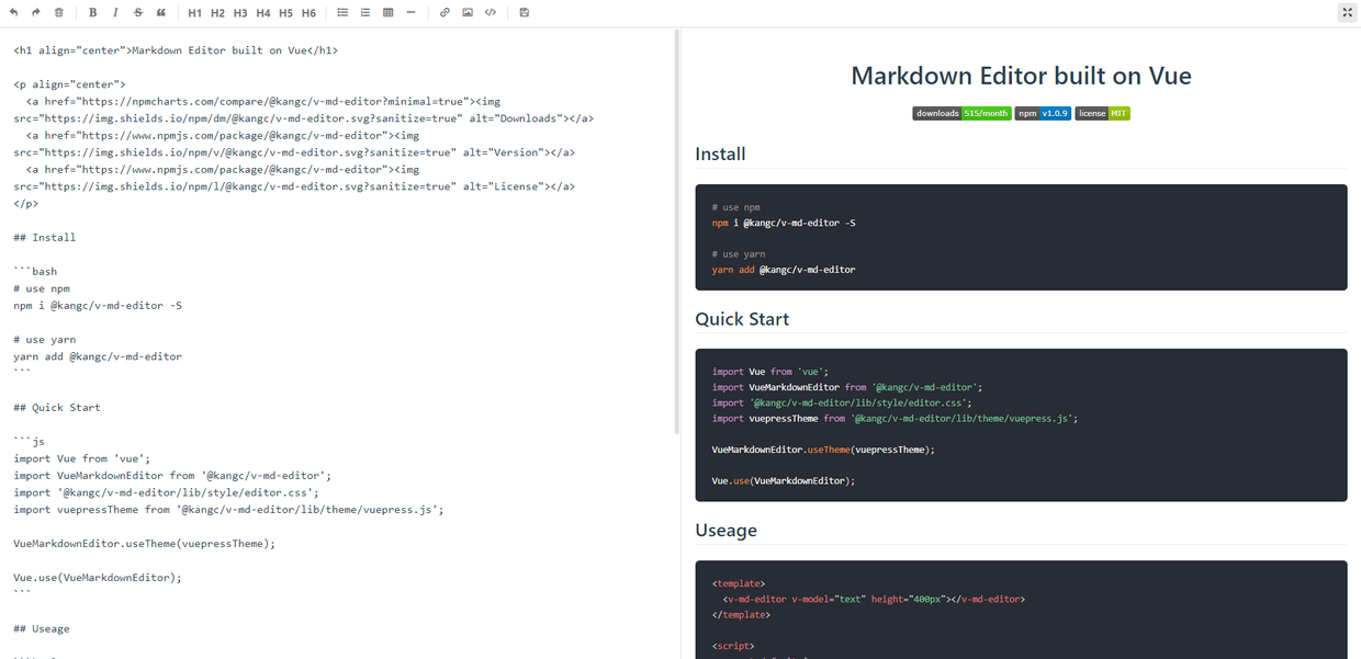 v-md-editor 是基于 Vue 开发的 markdown 编辑器组件