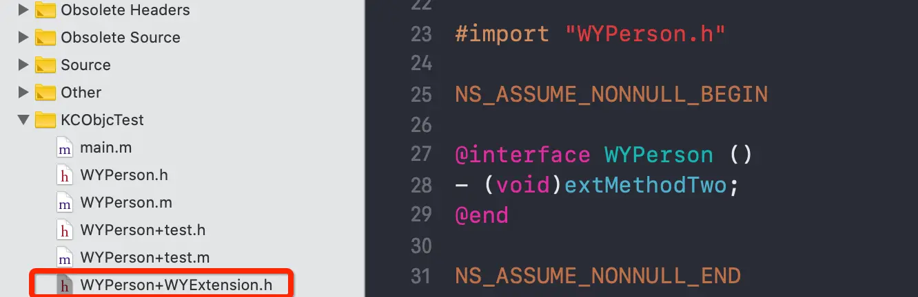 注意:当类扩展是以.m文件存在的时候,如果未通过import引入到类(WYPerson)的时候,它是不会被编译进去的,系统会认为这是个无用的文件