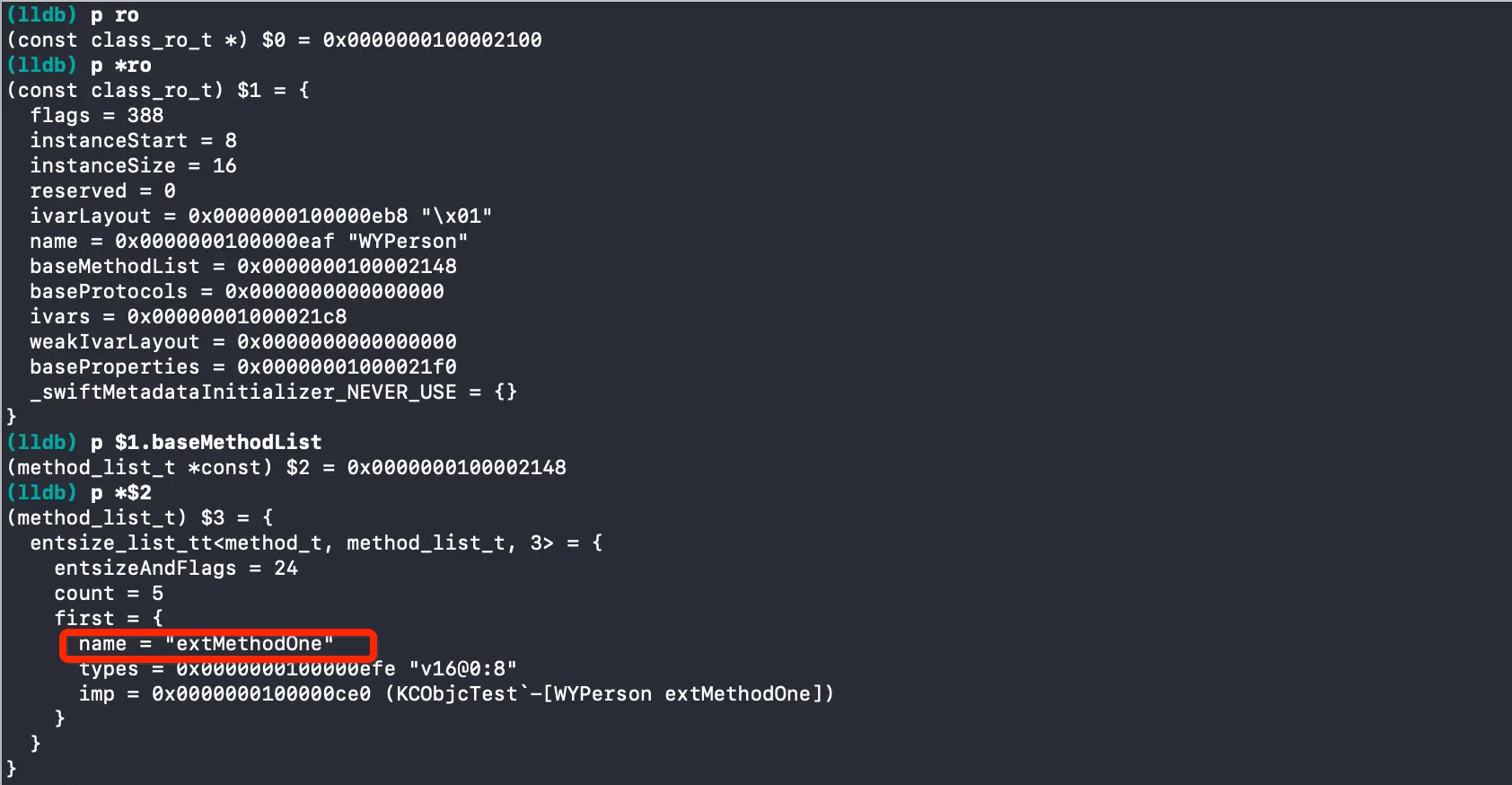 kName的setter和getter方法以及存在于ro的baseMethodList,而且同时我们打印出了extMethodTwo这足以说明类扩展在编译期就已经被编译进类的ro当中。