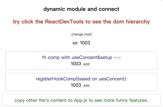 既然useConcent支持模块热替换,那么Ob当然也支持了,我们书写一个切换模块的逻辑在顶层App里,同时也渲染一个Ob实例。