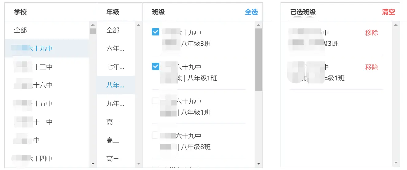 点击移除,某一个已选班级:
