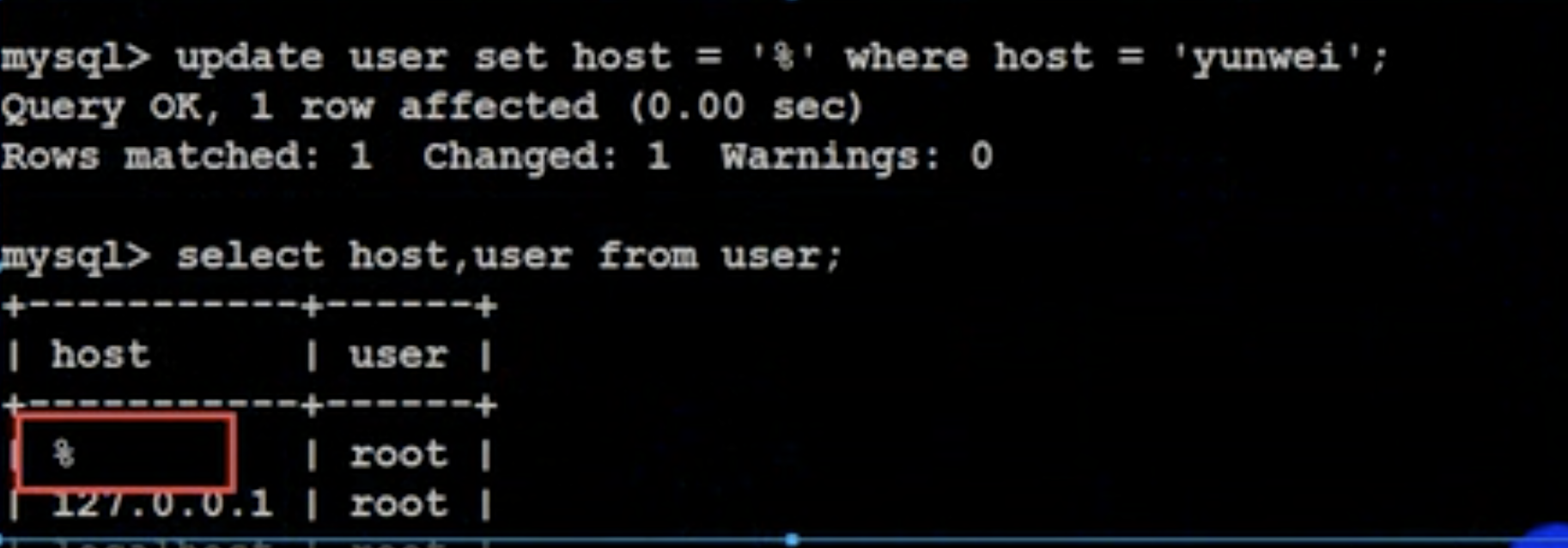 c.将一个字段的host值改为"%",表示可以任何地方登入