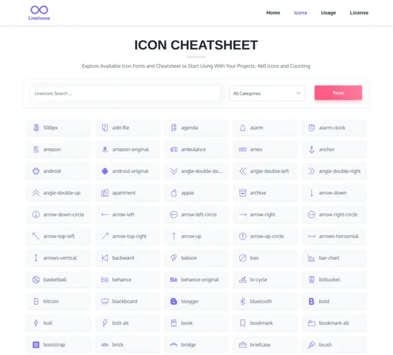 该图标包是完全免费的,并带有450多个线型图标。 它涵盖了来自不同类别的项目所需的每个基本图标。 LineIcons 还提供免费的CDN和清晰的文档,以轻松上手。 它带有2个不同的可伸缩软件包–可以根据项目需要使用WebFonts和SVG文件。