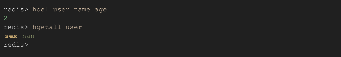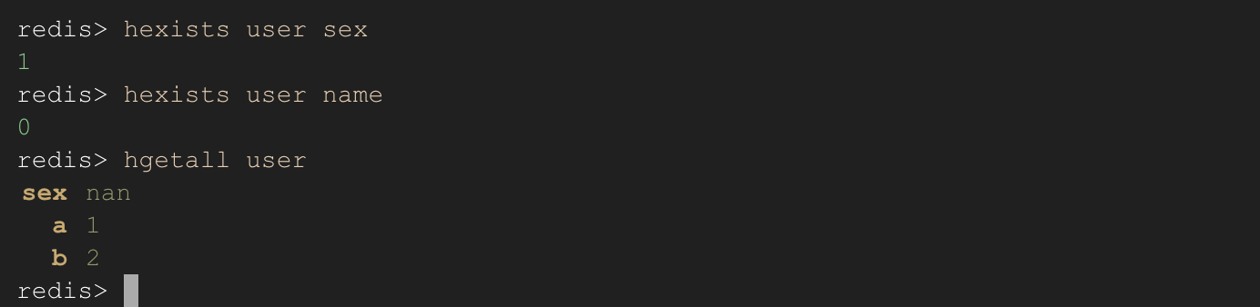 - hgetall操作可以获取全部属性,但如果内部field过多,遍历整体数据效率就会很低,有可能成为数据访问瓶颈。