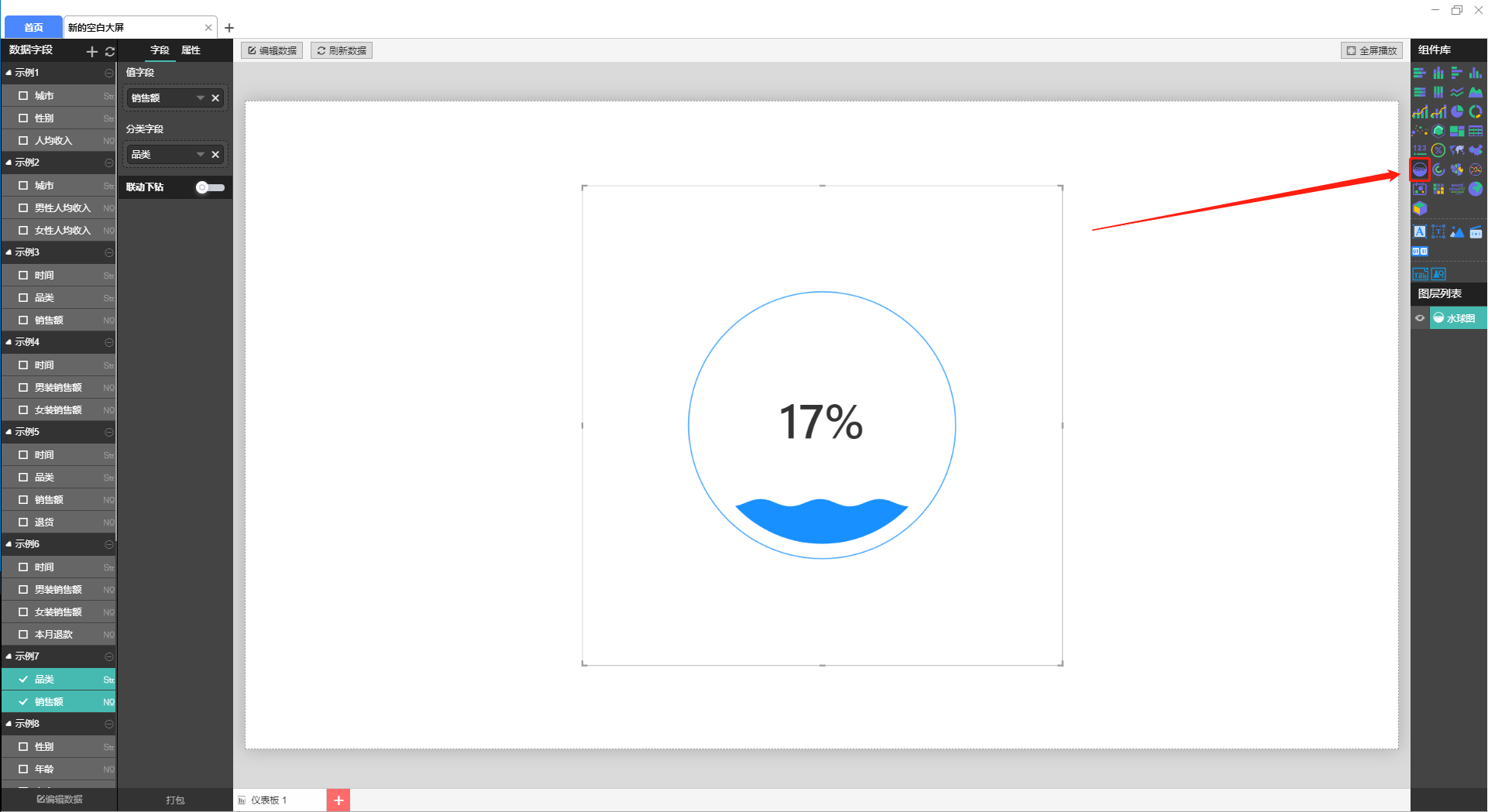 水球图可以动态展示某个子类数据在整个分类中的百分比。