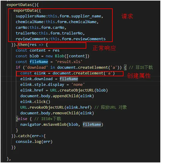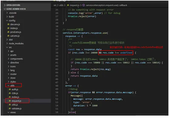 问题2 : 在解决问题1的过程中,发现返回的数据没有走 正常响应 的流程,而是catch 出一个异常,走了 异常响应 的流程,导致无法下载文件。这是因为guns-lite框架本身设置了axios的过滤的问题,其对成功代码为 非20000 得主动抛出了异常,因此需更改axiox前端页面过滤的公共代码。 问题描述图片: