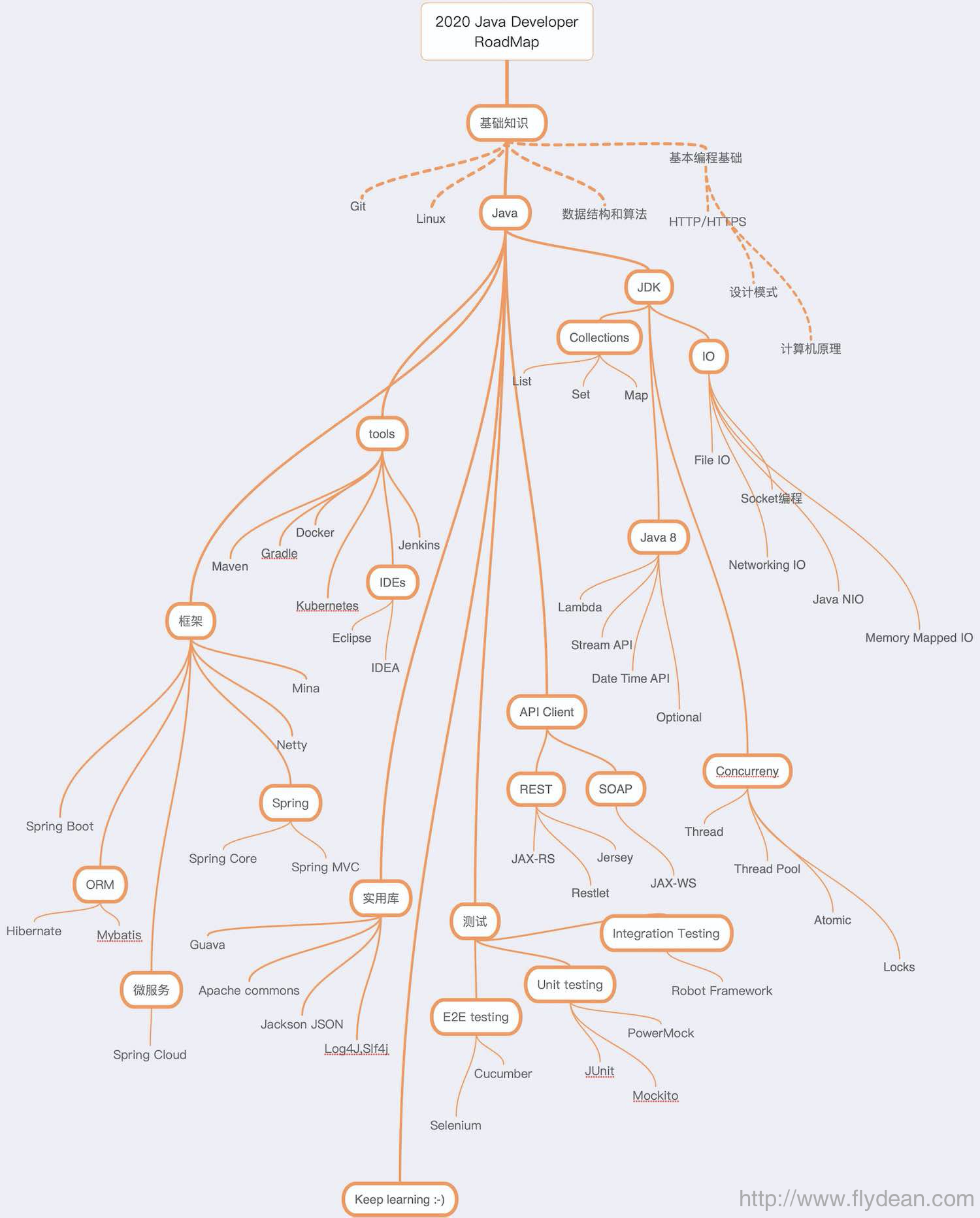 上面的RoadMap图中列出了作为一个java程序员需要掌握的技术路线,所有技术都懂那当然非常好,如果还没掌握也没关系,just keep learning!