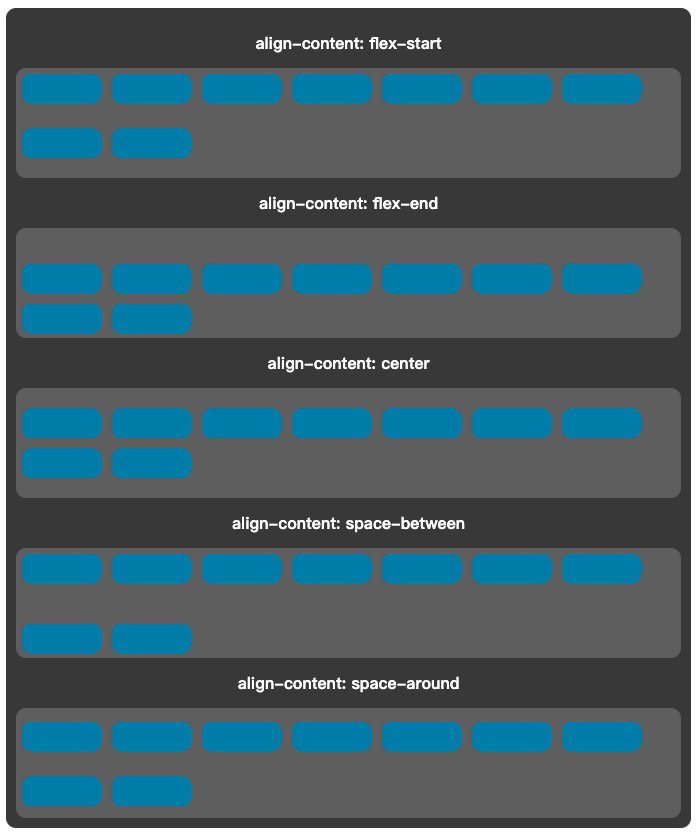 align-content: 多根轴线的对齐方式(只有一根轴线,该属性不起作用)