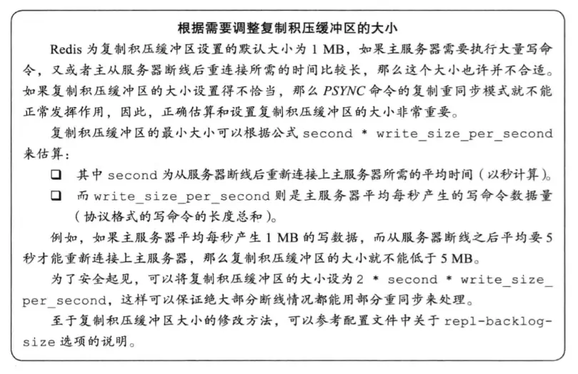 复制积压缓冲区是由主服务器维护的--个固定长度(fixed-size)先进先出(FIFO)队列,默认大小为1MB。