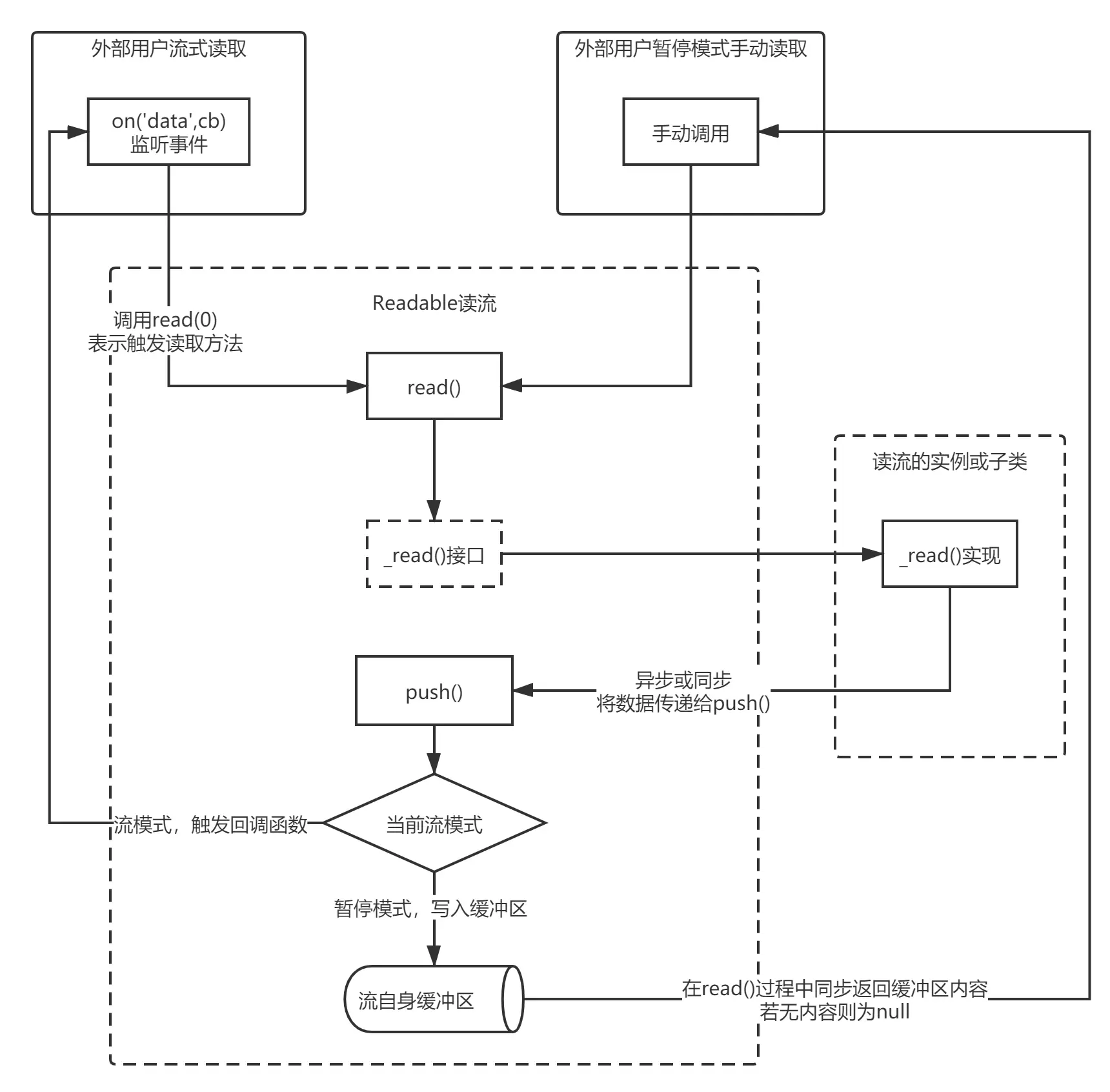 _read()时,如果资源中已有可用数据,则应该使用this.push(dataChunk)将数据加入到读流的缓冲区队列中,然后_read()应该持续以上操作直到push()返回false。