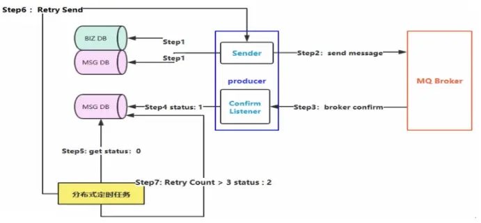 - step7如果尝试了3次(可按实际情况修改)以上则将状态置为2(消息投递失败状态)
