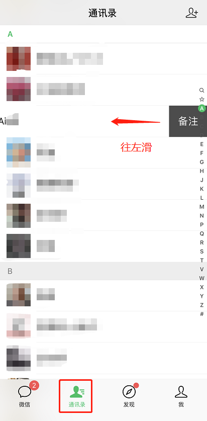 点击微信“通讯录”,苹果用户把要修改的好友往左滑,就能对应的修改备注。