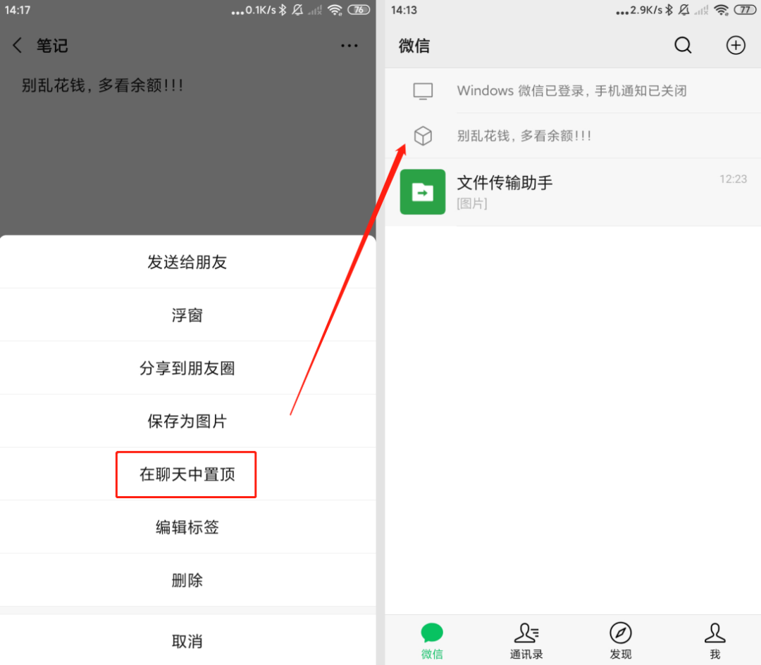 还可以将“收藏”置顶到聊天首页,可以用来提醒。