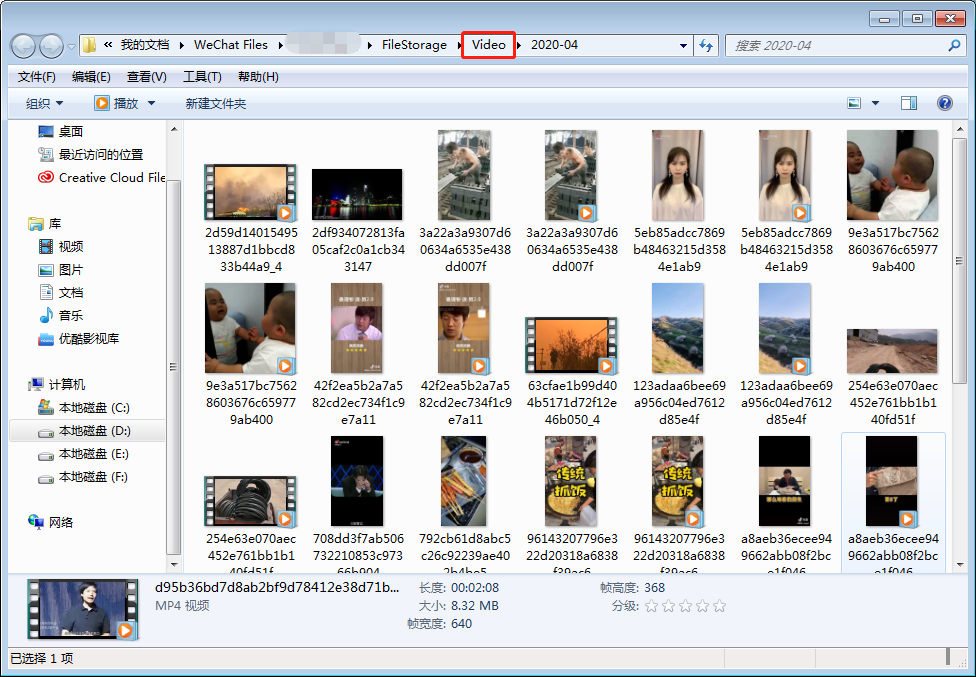 想要批量保存视频的话,对着视频点击鼠标右键,选择“打开文件夹”,就能直接查看微信自动缓存的视频及封面。