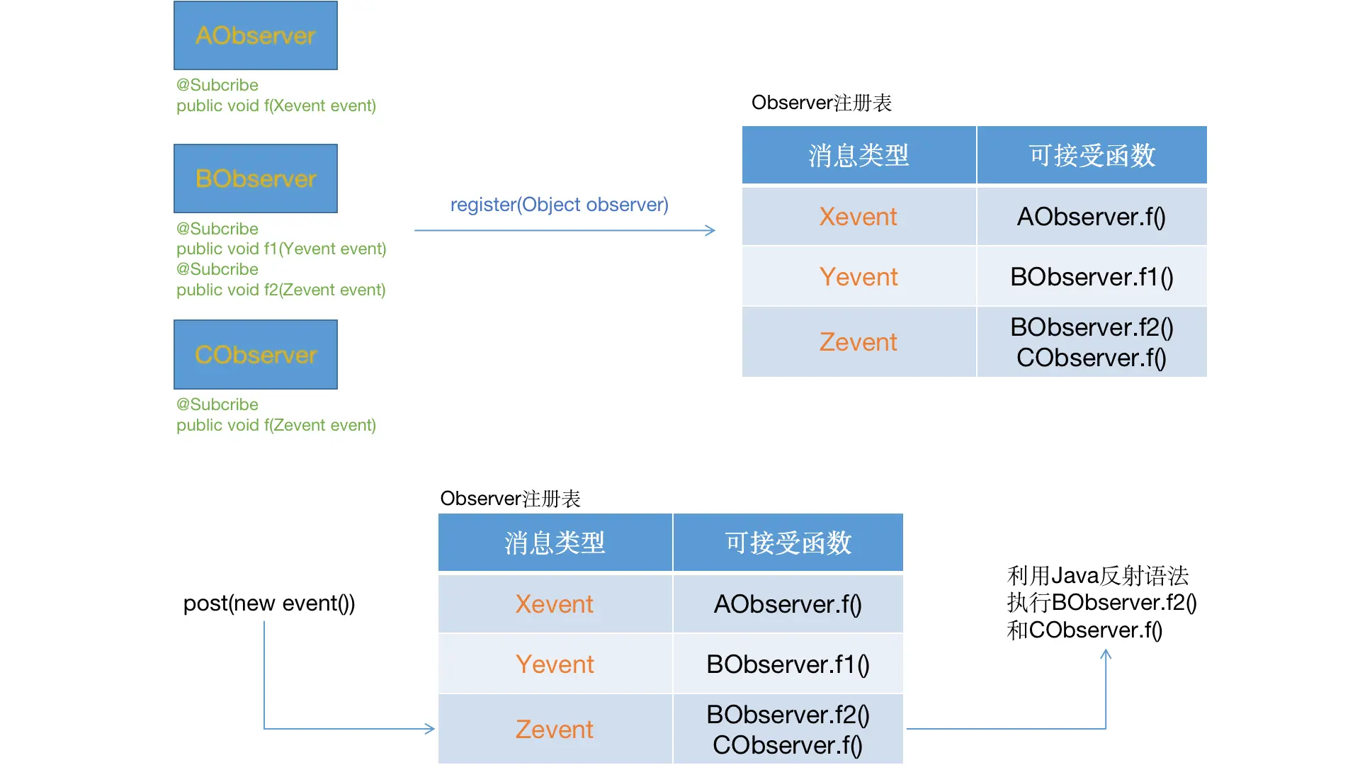 消息发布者(或者叫被观察者),发送了某个事件消息,EventBus会根据Subcriber注解以及Event事件,找出合适的订阅者(或者叫观察者),然后通过Java反射执行订阅者的响应方法。