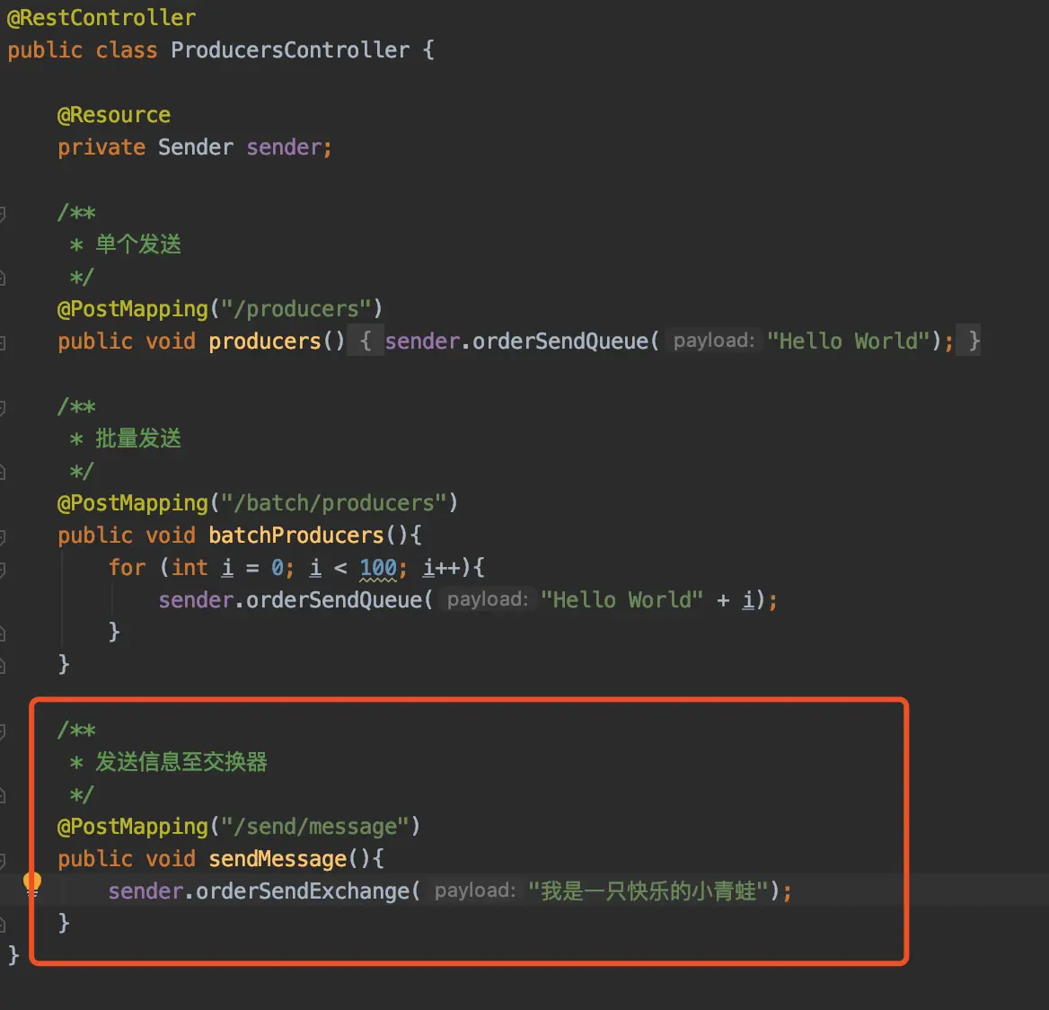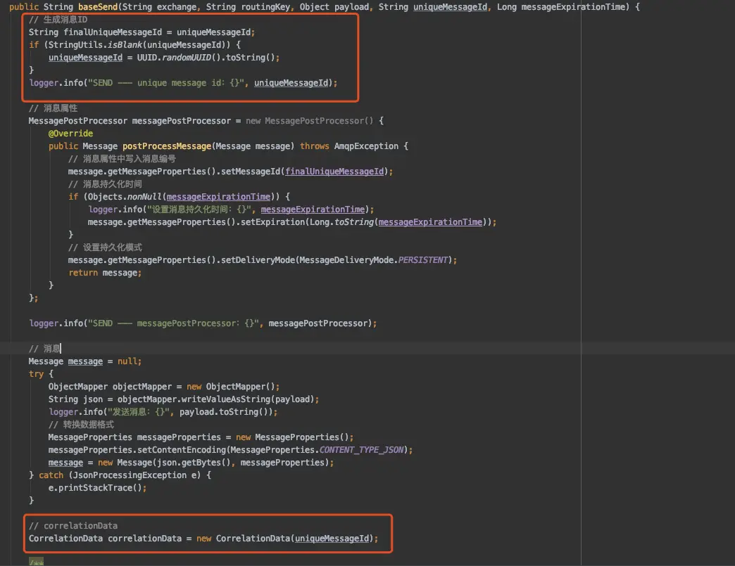 return baseSend(RabbitMqKey.TEST_EXCHANGE, "", payload, null, null);