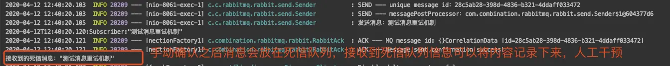 System.out.println("接收到的死信消息:" + msg);