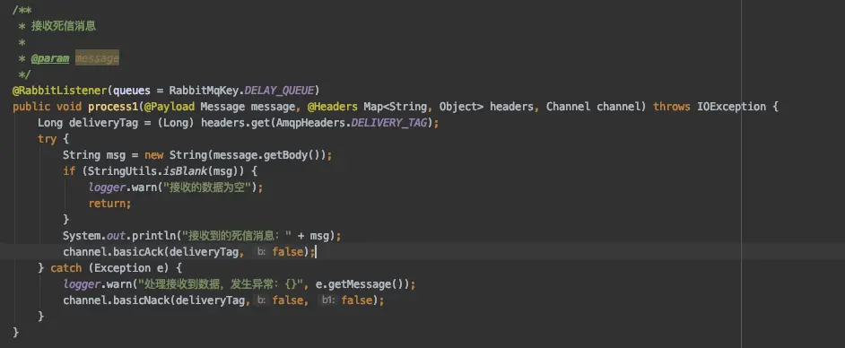@RabbitListener(queues = RabbitMqKey.DELAY_QUEUE)