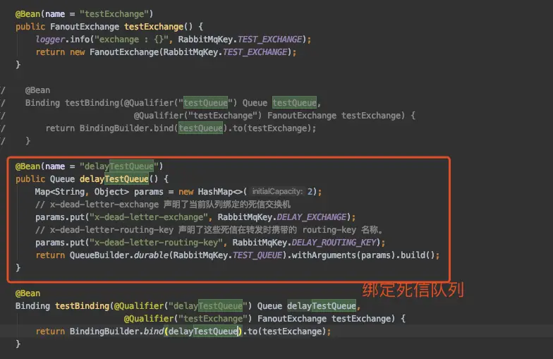 return BindingBuilder.bind(delayTestQueue).to(testExchange);