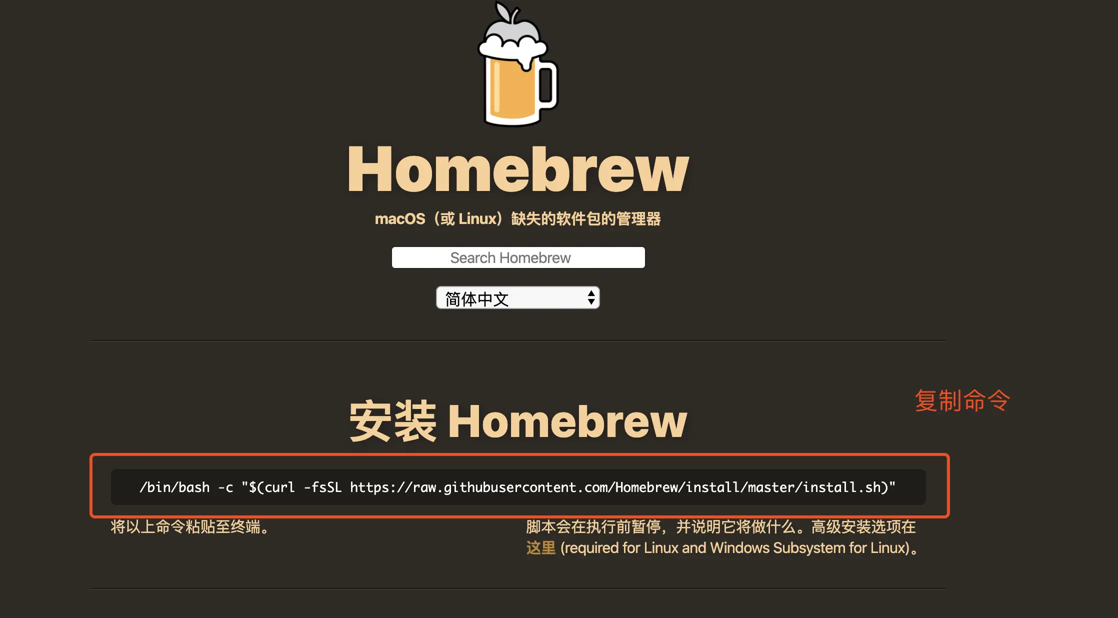 1、进入Homebrew官网,复制命令: