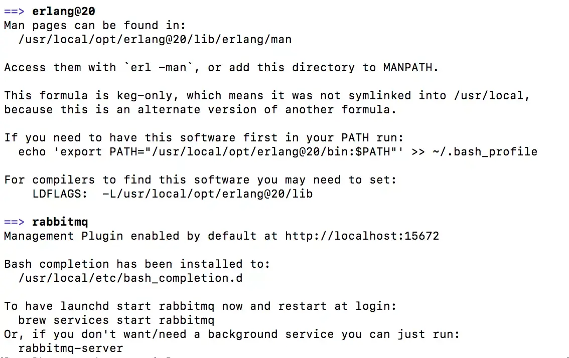 1、打开终端,输入如下命令:brew install rabbitmq,点击回车键等待安装,看到如下界面即为成功: