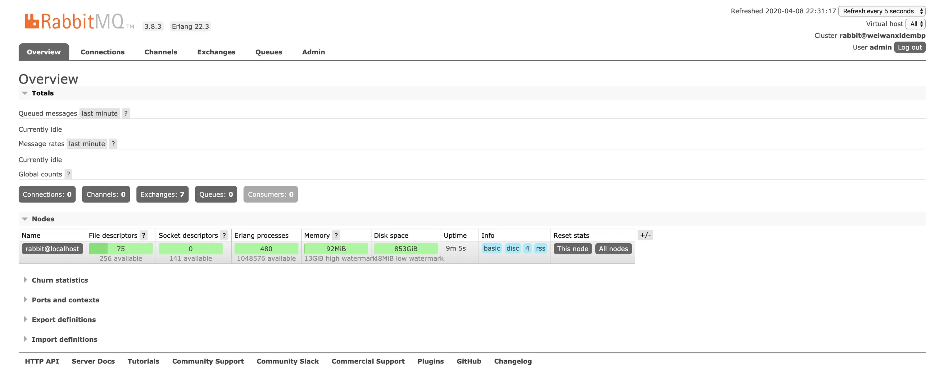 可登陆管理控制台,同时可以查看rabbitmq节点的相关信息(进程数,内存使用情况,磁盘使用情况等)