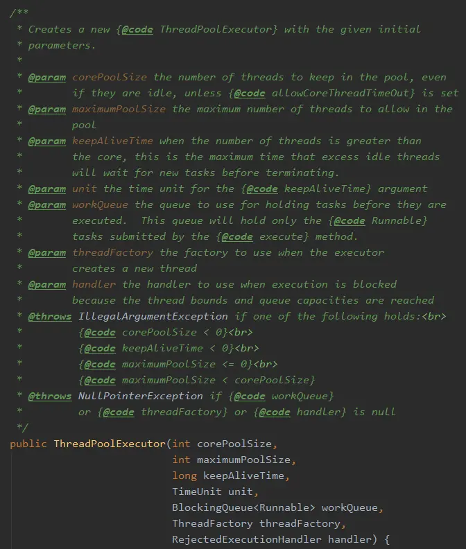 上面的 7 个参数中,我们主要需要关心的参数是: corePoolSize、maximumPoolSize、workQueue(队列长度)。